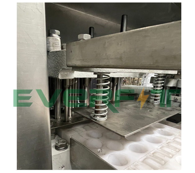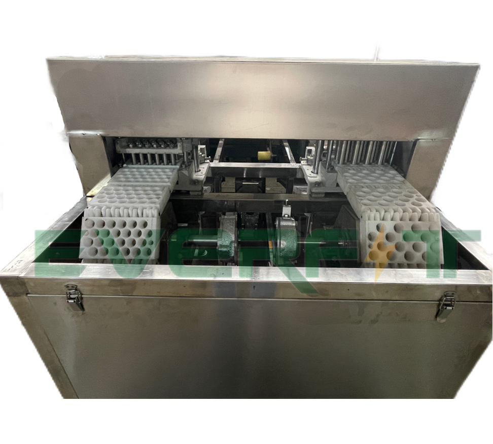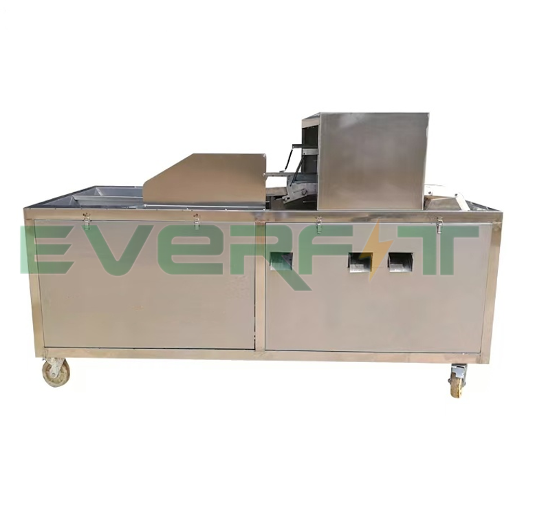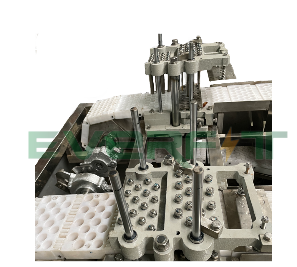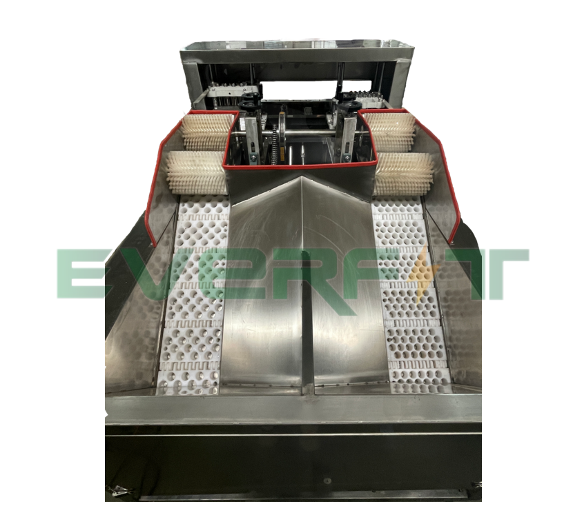 The storage hopper and conveyor belt are directly combined, according to the shape and diameter of the fruit, the template is selected, the fruit is poured into the storage hopper, so as to achieve the effect of feeding and conveying, the fruit will automatically enter the template hole after falling on the conveyor belt, and the excess fruit will be brush into other holes through the brush, so that the feeding efficiency reaches more than 95%, which greatly improves the work efficiency. After the positioning of the hole, the fruit continues to be transported and promoted, the fruit in the process of conveying and promoting the use of the machine tool process for punching the core, the nuclear falls into the nuclear exhaust dustpan inside the automatic flow collected together, the fruit flushed through the nucleus continues to be transported to the next link for fruit, the use of large cap rod device to make the shape of the discharged fruit completely unchanged, The fruit automatically falls into the dustpan and automatically flows out and collects together, so as to achieve the separation of the fruit and the core.